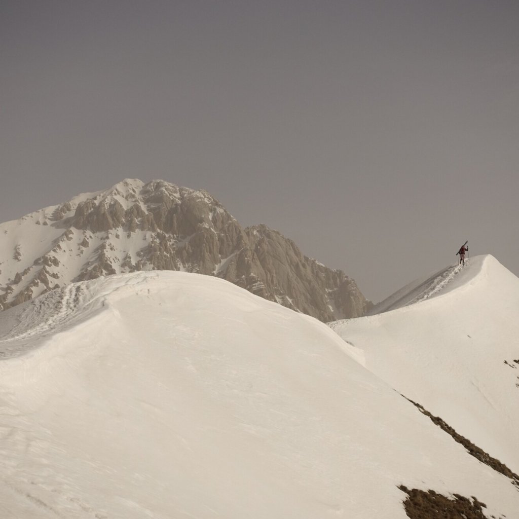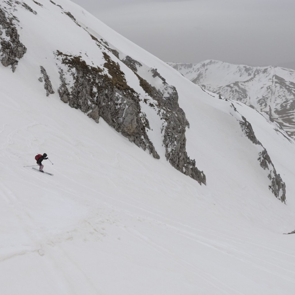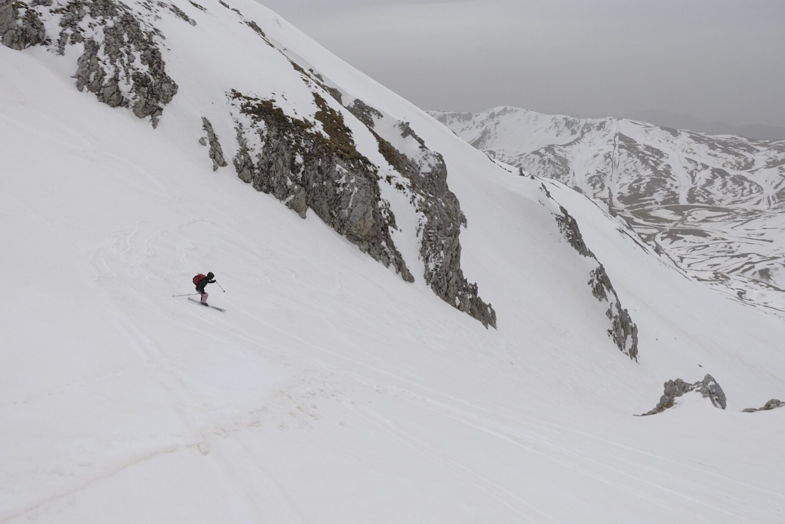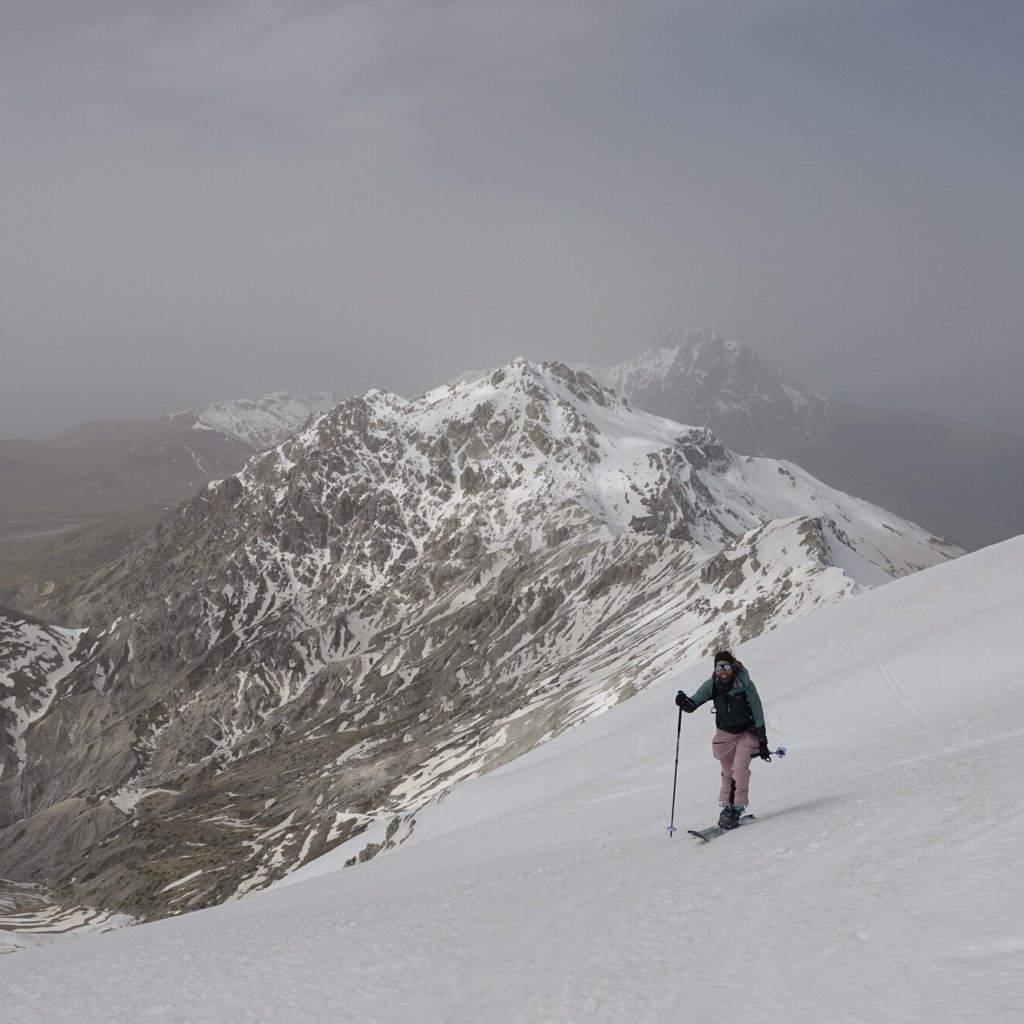 Cosa rende unico lo scialpinismo qui? I pendii sono omogenei, tagliati col laser, i canali (le “rave”) sono creati apposta per lo sci, le possibilità di salita e discesa sono varie e tecniche. La neve trasforma subito, il firn è di un livello assoluto, imparagonabile. C’è poca gente, e i colori e i contrasti lasciano a bocca a perta. Il Gran Sasso in primavera è selvaggio, desolato, silenzioso, si sentirano solo gli slash delle nostre curve e il vento che spira volentieri.