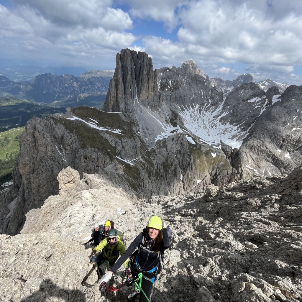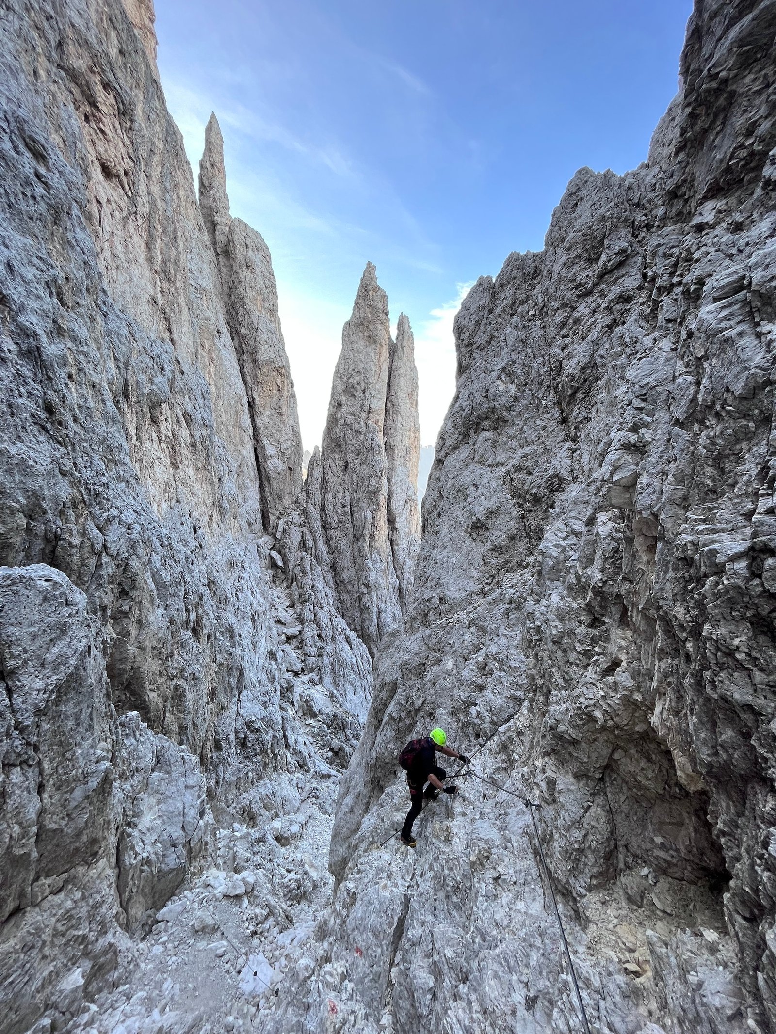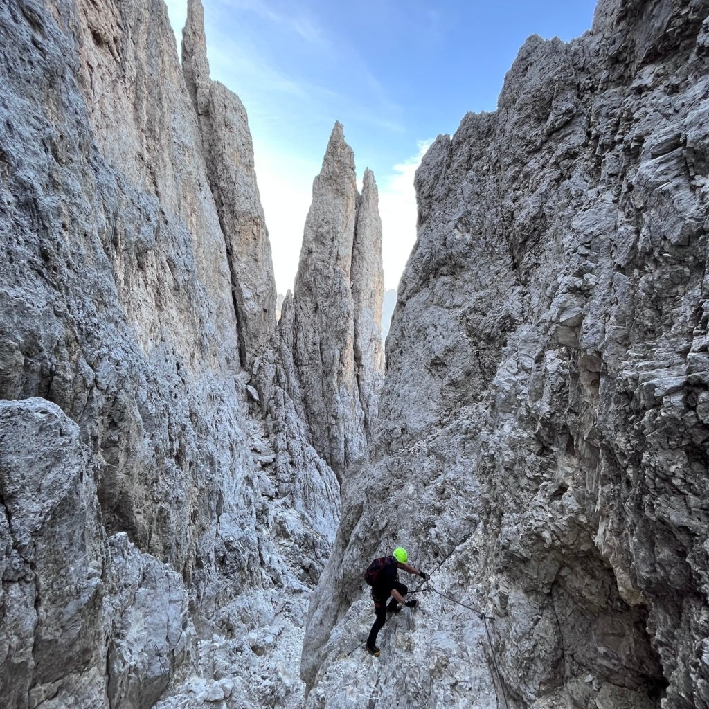 Percorreremo la ferrata Roda di Vael e le Creste del Masarè, la via ferrata Santner e infine quella che raggiunge la vetta più alta del gruppo: la via ferrata al Catinaccio d’Antermoia! Passeremo sotto le iconiche Torri del Vajolet, attraverseremo la meravigliosa omonima valle e cammineremo vicino al Lago di Antermoia dopo averlo visto dalla cima!